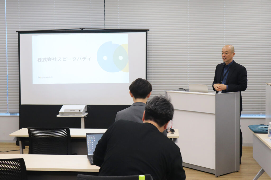 続いて、スピークバディの立石社長より、会社概要やAI英会話アプリの強み、法人事業の展開、そして今後のビジョンについてご説明いただきました。
